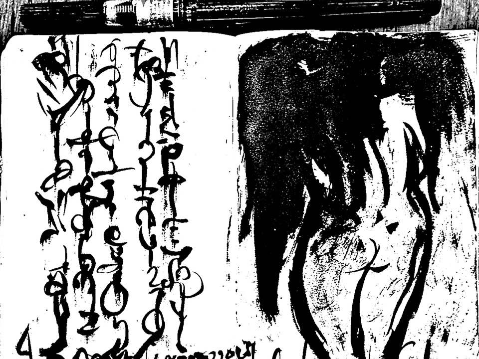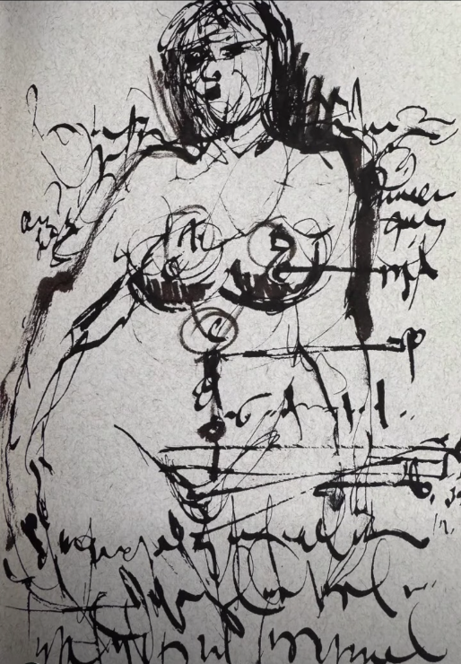 Por eso luego somos capaces de llevar mediante el dibujo , esas experiencias tan extrañas para otros y tan familiares para el que dibuja. Como este dibujo de la Serie Virgenes de Media Noche”. de mi “cuaderno de procesos creativos” (que no bitácora como ya lo he mencionado en otras textos). Esta virgen es producto de un mundo muy intimo, de tal modo que en ella se mezclan elementos medievales con dibujos textuales que dicen algo que pocos pueden leer, porque es una escritura asémic no accesible en su contenido textual, pero si visual, o sea, donde el texto dibujado solo es un pretexto y es imagen.